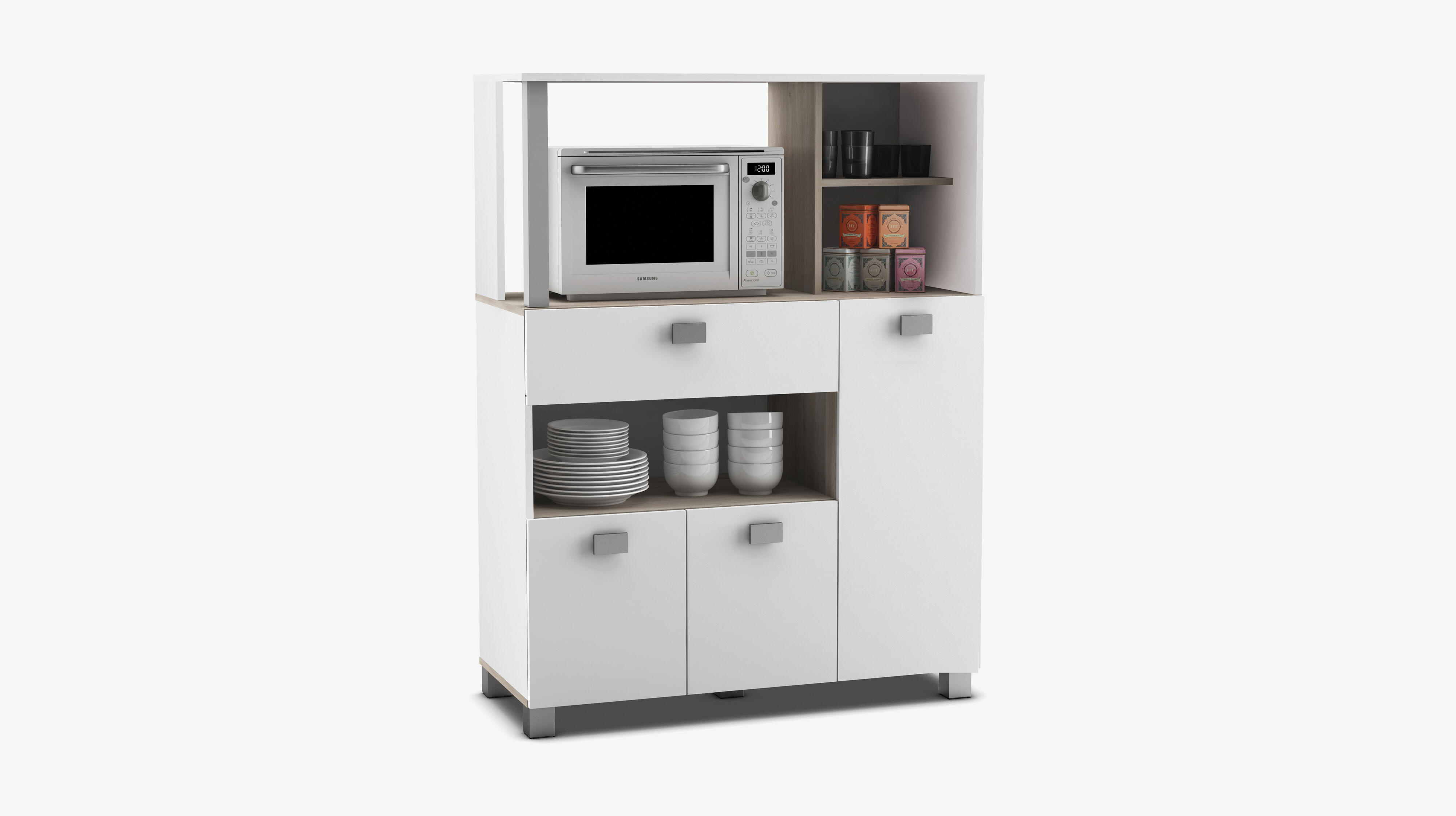 - Large capacité de rangement : 4 niches ouvertes dont 1 micro onde, 1 tiroir, 3 portes, 1 grande tablette supérieure pour plus de stockage