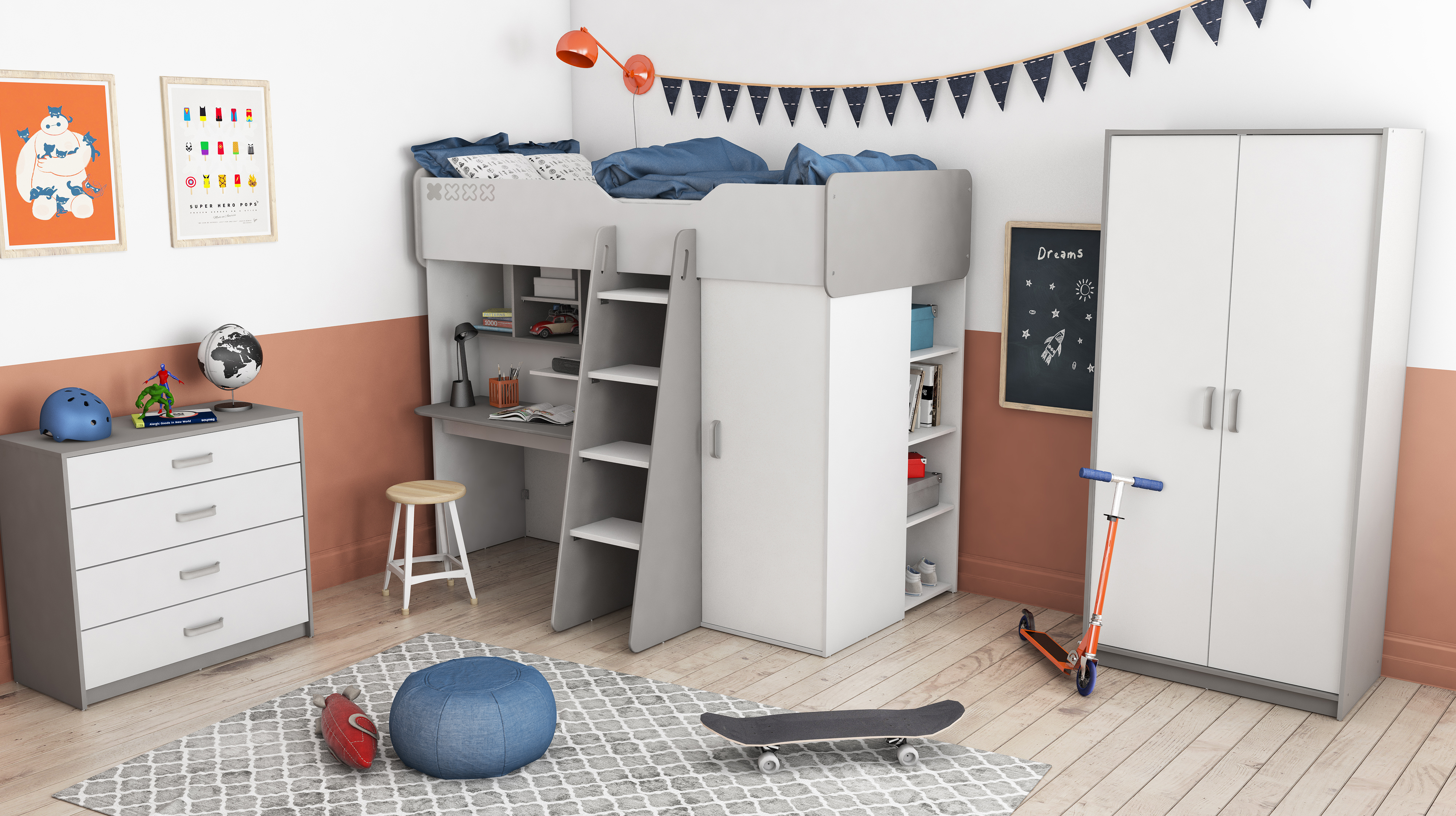 - Sécurisant : formes arrondies pour la sécurité de l'enfant, façades grises laquées avec peinture à l'eau sans métaux lourds, échelle sécurisée avec poignées prise en main